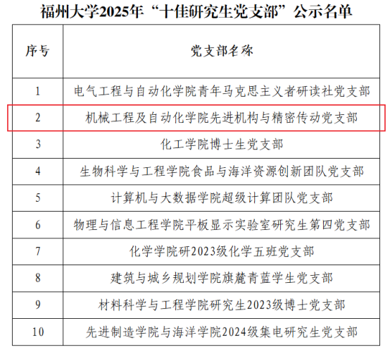 近日,经学院党委申报推荐、学校评审,我院先进机构与精密传动党支部脱颖而出,荣获福州大学2025年“十佳研究生党支部”称号。此前,我院2022级博士研究生林嘉欢同学荣获福州大学2025年“十佳研究生党员”称号。此次评选活动中,学院同时斩获两项校级荣誉,实现了“十佳研究生党员”与“十佳研究生党支部”的双丰收,标志着我院研究生党建工作取得新成效。