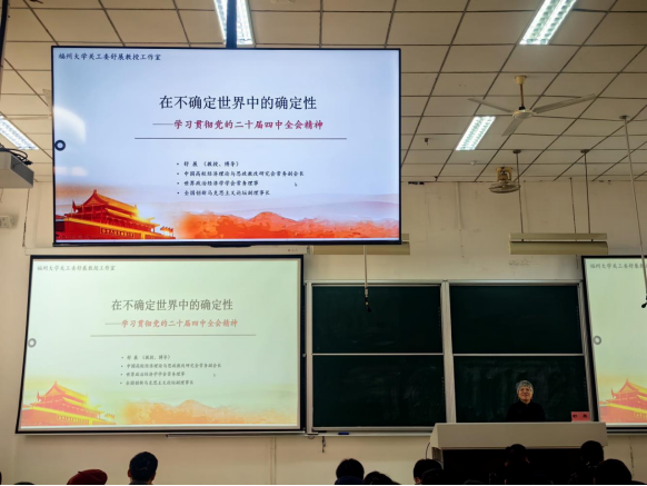 为深入学习贯彻党的二十届四中全会精神,引导广大师生准确把握“十五五”时期的发展蓝图与战略部署,1月8日我院在文四101教室举办学习贯彻党的二十届四中全会精神宣讲报告会。特邀福州大学学习贯彻党的二十届四中全会精神专家宣讲团成员、马克思主义学院舒展老师作《在不确定世界中的确定性——学习贯彻党的二十届四中全会精神》的辅导报告。宣讲报告会由陈伟民书记主持,全院教职工和学生代表参加报告会。