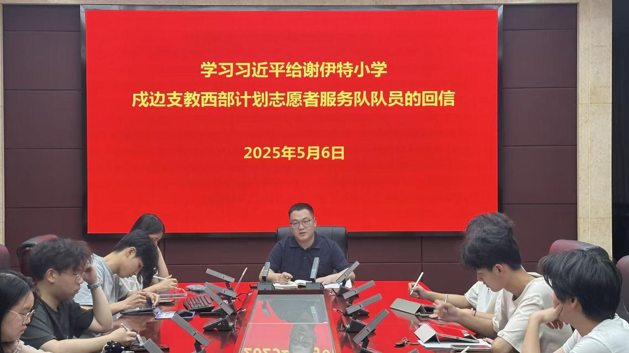 2025年5月6日,我院在机械南401召开专题学习会,组织学生骨干深入学习习近平总书记给谢依特小学戍边支教西部计划志愿者服务队队员的回信精神。院团委副书记李辉容老师及各年级学生代表参与学习,共同感悟新时代青年的责任与担当。