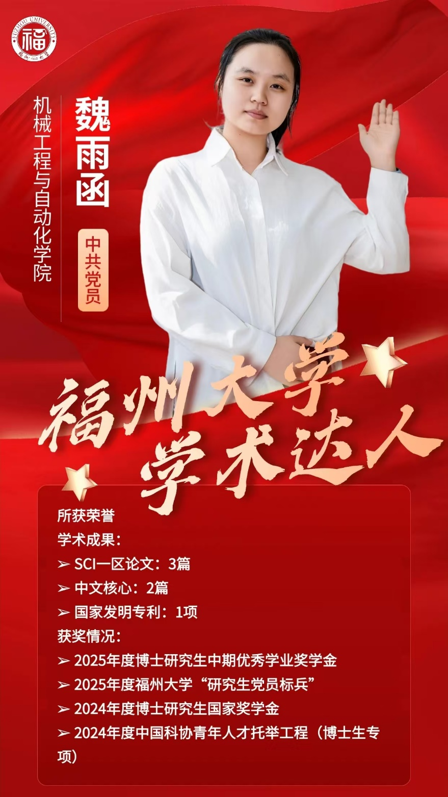 近日,2025年度福州大学“学术达人”评选结果揭晓,我院2022级博士研究生魏雨函以严谨的求学态度、扎实的学术功底与突出的科研成果成功入选。