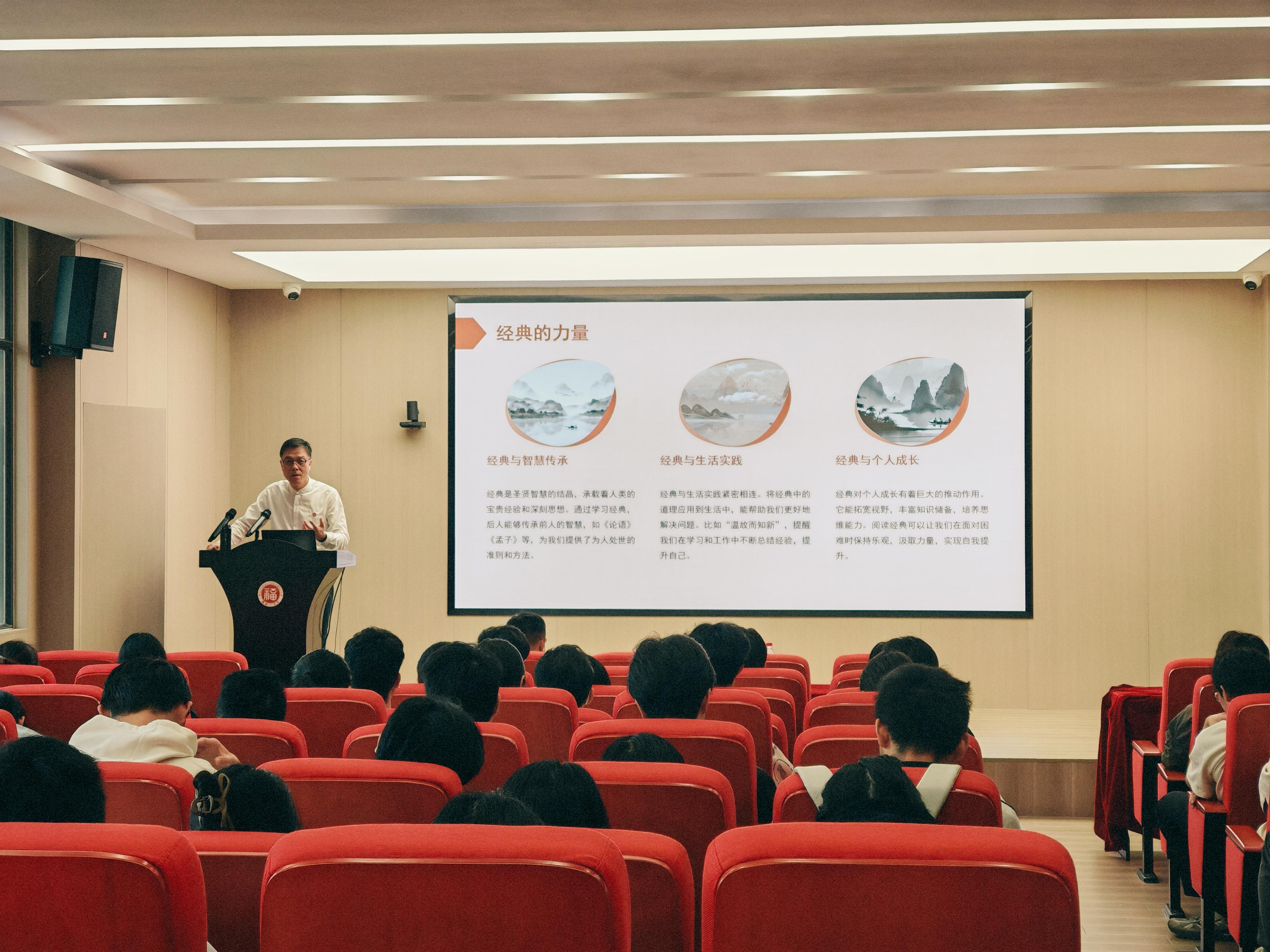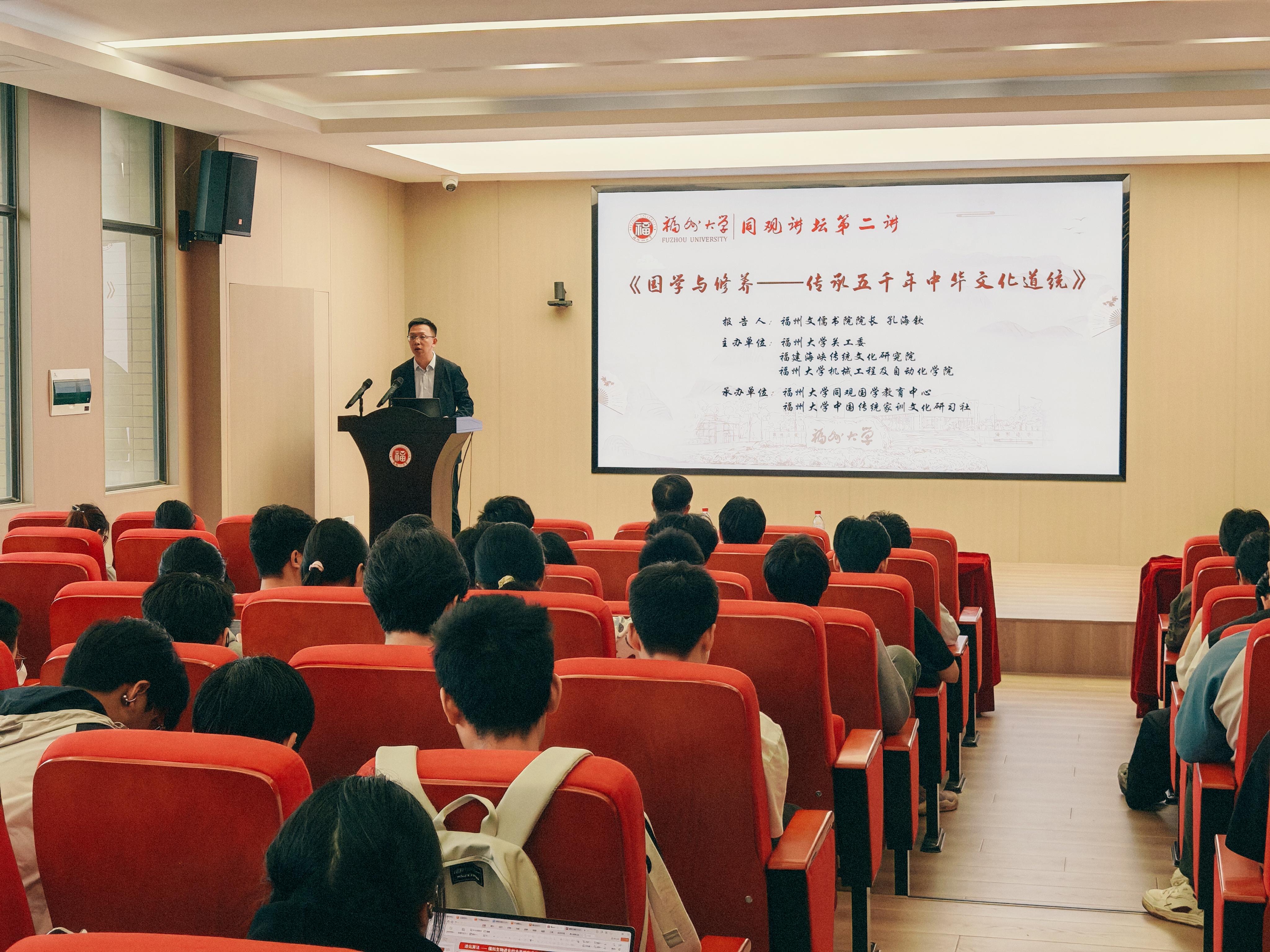 为传承中华优秀传统文化,激发机械学子国学热情,坚定文化自信,4月16日下午,福州大学机械工程及自动化学院在机械楼北415举行“同观讲坛”第二讲,福州文儒书院院长、福州大学中国文化研究所副所长孔海钦应邀作题为《国学与修养》的专题讲座。学院党委副书记谢武主持讲座,100余名学生到场聆听。